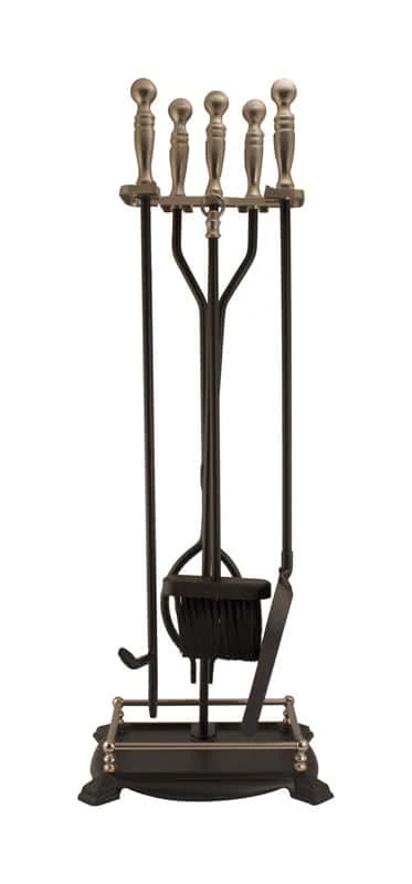 Combine contemporary and antique elements on your hearth using this tool set. This classic and functional set keeps your fire tools within easy reach, and its black body lends a classic feel to the unit. A nickel finish on the top of the stand and tool handles completes the color scheme, creating a timeless effectEach tool has a rounded handle with an orb at the top.Fireplace toolset with nickel handles rods.
